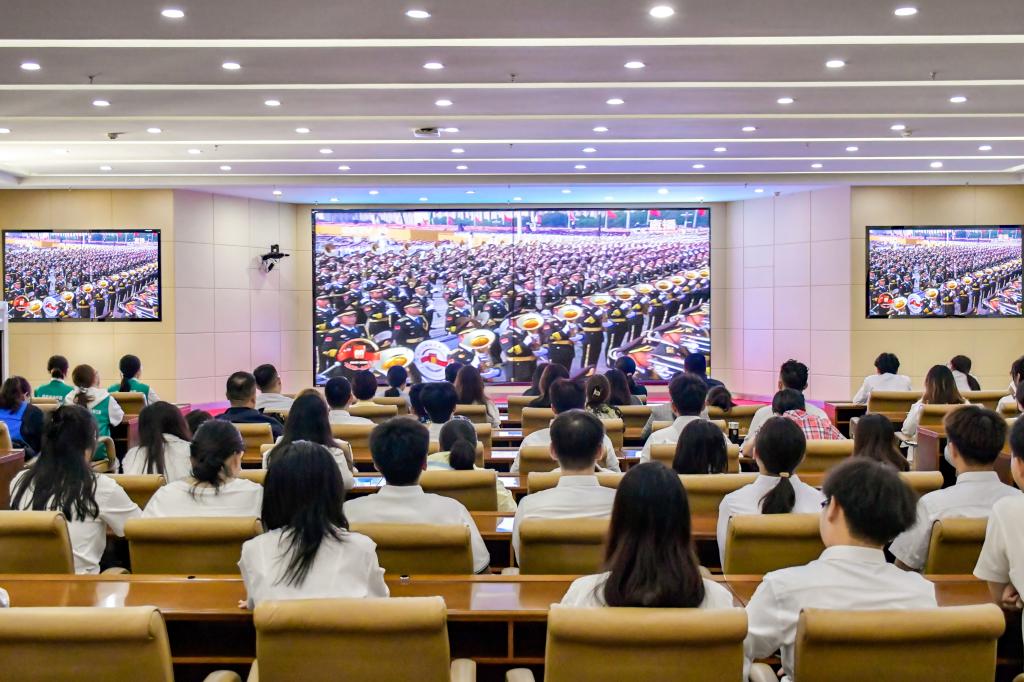 在場師生懷著崇敬的心情觀看大會,聆聽習近平總書記重要講話。當一個個威武雄壯的方隊邁著整齊步伐通過天安門廣場,當精良的裝備方隊展示著我國國防和軍隊建設的最新成果,當空中梯隊以排山倒海之勢飛過高空,會議室不時響起陣陣掌聲和贊嘆聲。