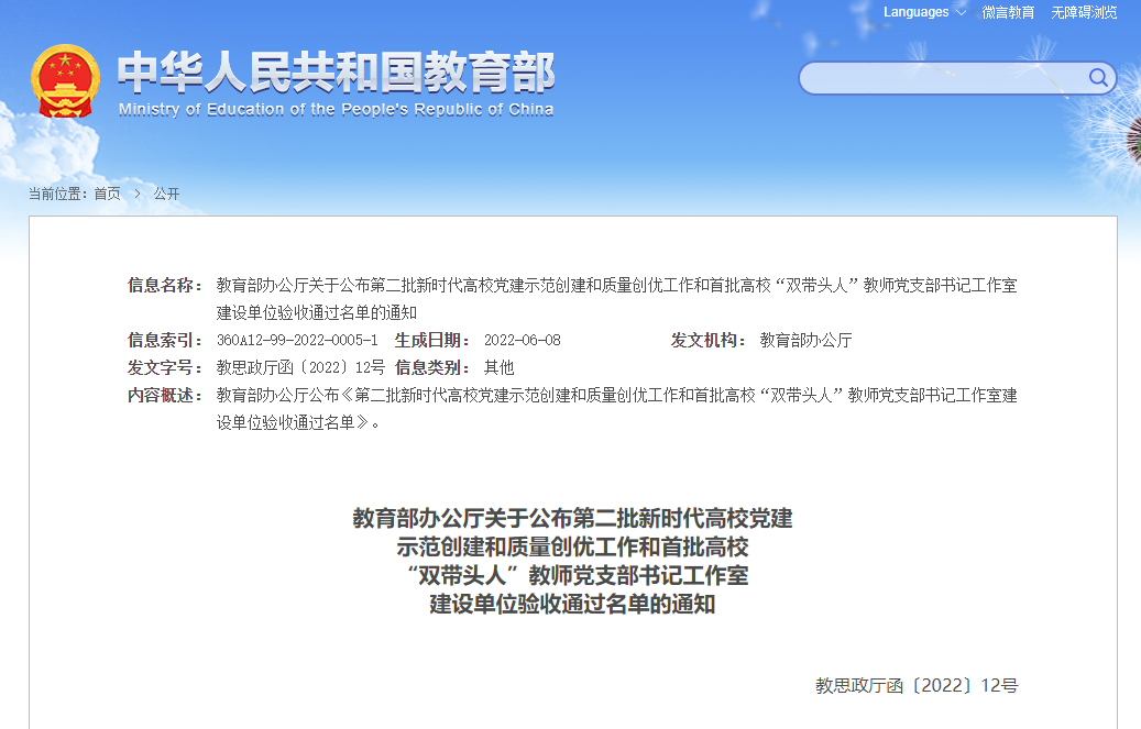 近日,教育部公布了第二批新時代高校黨建示范創建和質量創優工作和首批高校“雙帶頭人”教師黨支部書記工作室建設單位驗收通過名單,我校文學院教師黨支部順利通過驗收。此次驗收工作通過對創建單位兩年建設期內的軟件建設和硬件建設、統籌規劃和分步實施、整體提升和品牌塑造等培育創建工作整體考核評價,經創建單位對標自查總結、省級黨委教育工作部門把關審核、教育部思想政治工作司審查,全國共有990個支部順利通過驗收。20...