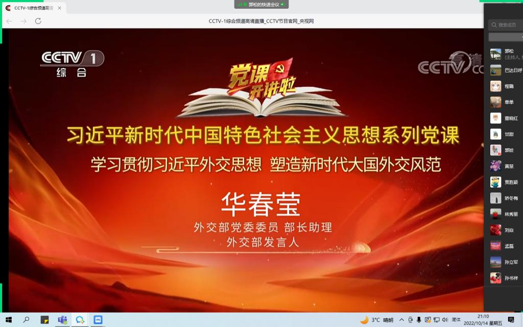 《黨課開講啦》習近平新時代中國特色社會主義思想系列黨課之“學習貫徹習近平外交思想 推進中國特色大國外交”節目于10月13日至14日晚在中央電視臺綜合頻道(CCTV-1)播出,我校第一時間轉發學習通知,積極組織全校師生黨員學習收看。本期黨課由外交部黨委委員、副部長謝鋒,外交部發言人華春瑩,分別以《學習習近平外交思想推進中國特色大國外交》《學習習近平外交思想塑造新時代大國外交風范》為主題,結合各自的工作經歷,采...