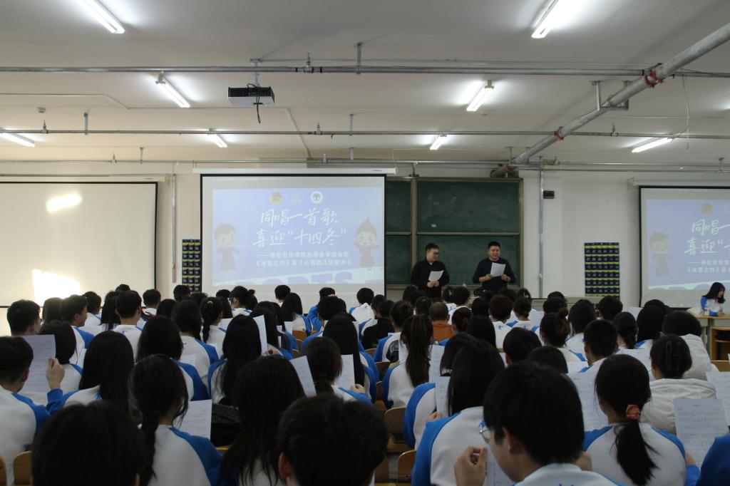 1月24日下午,我校全體“十四冬”志愿者分別在圖書館四樓報告廳、崇文樓A201會議室、崇文樓B301會議室和401會議室開展“同唱一首歌 喜迎冬季盛會”學唱“十四冬”主題曲活動。活動邀請音樂與舞蹈學院教師吳曉斌,“十四冬”帶隊教師孟磊、李陽、包孟磊進行指導,教唱全國第十四屆冬季運動會會歌《冰雪之約》和志愿者之歌《小雪團向前沖》。《冰雪之約》是“十四冬”的會歌,旋律優美動聽,歌詞意境深遠,巧妙地將冰雪運動特色、...