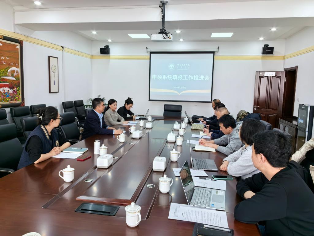 為順利完成申碩材料填報工作,3月19日上午,我校在逸夫樓419會議室召開申碩系統填報工作推進會。校黨委委員、副校長敖特根參加并主持會議,各申請點負責人及骨干教師、研究生處相關人員參加了本次會議。會上,敖特根強調,各負責人要認真學習填報要求、嚴格按照國務院學位辦要求規范填報材料,扎實開展好碩士學位申報工作。研究生處對相關操作進行了解釋說明并進行了模擬培訓