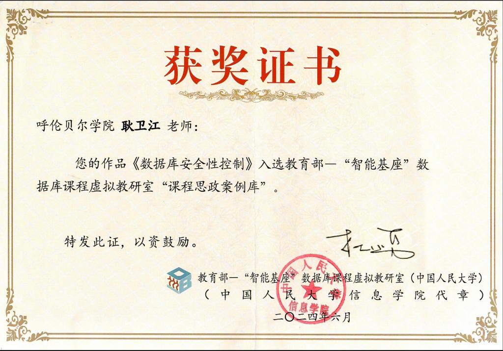 6月21日,由呼倫貝爾學院人工智能與大數據學院《數據庫原理》課程教學團隊選送的《數據庫安全性控制》課程思政教學案例參加由教育部數據庫課程虛擬教研室(牽頭單位:中國人民大學)主辦,相關企業協辦的“全國高校數據庫課程思政教學案例”評選活動,并入選教育部─“智能基座”數據庫課程虛擬教研室課程思政案例庫,獲得入選獲獎證書。本次評選旨在落實教育部高等教育司關于開展虛擬教研室試點建設工作的通知,貫徹落實立德樹...