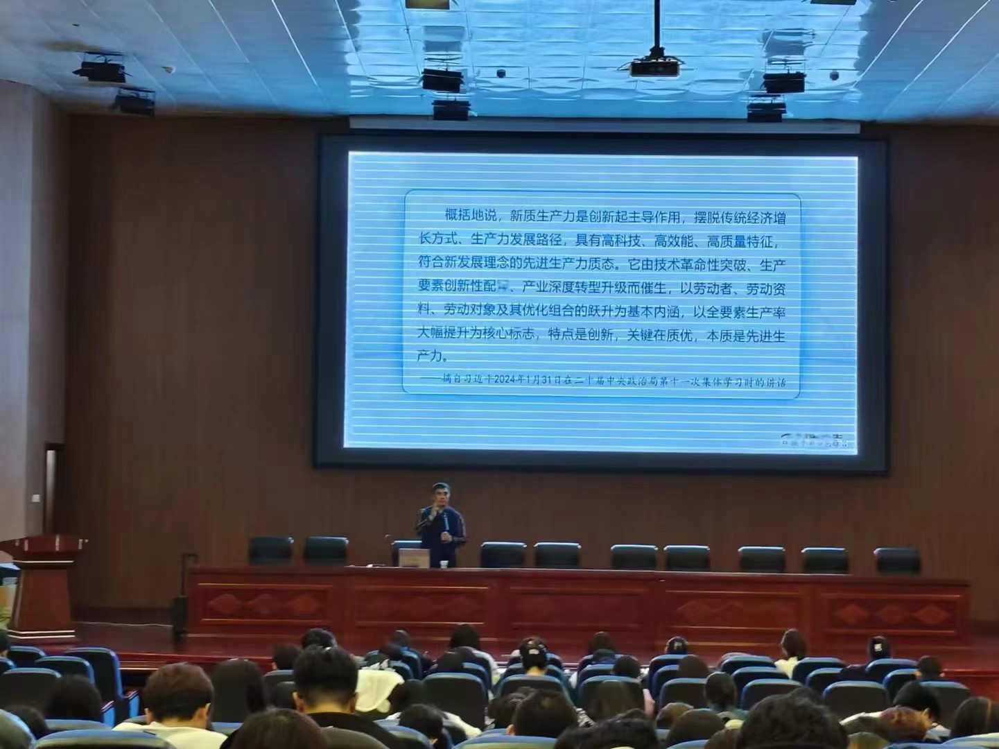 為落實立德樹人根本任務,堅持為黨育人、為國育才的初心使命,10月30日晚,校黨委委員、副校長敖特根深入思政課課堂,在圖書館四樓報告廳為學校300余名師生上了一堂主題為“加快發展新質生產力”的“形勢與政策”課。課上,敖特根圍繞“事關全局的國之大者”“創新質優的質態特征”“統籌推進的系統工程”三大問題,緊密結合當前世界百年未有之大變局的突出特點,運用豐富的史料、鮮活的案例,語重情深、深入淺出地闡釋了什么是...