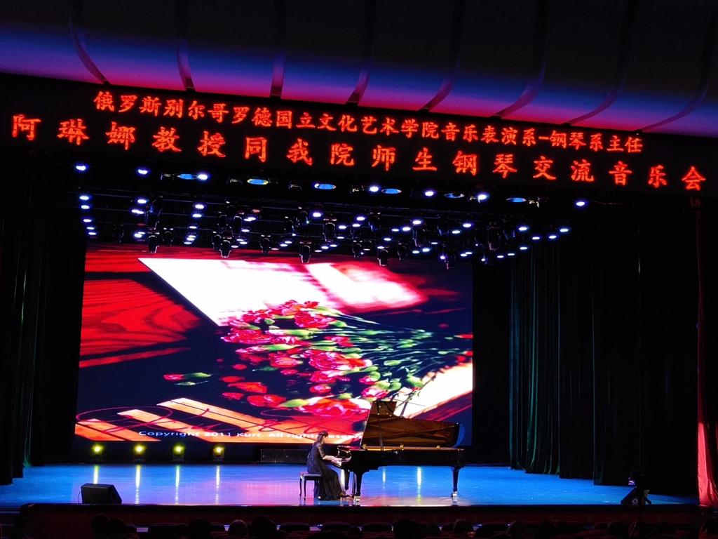 ?12月16日晚,俄羅斯別爾哥羅德國立文化與藝術學院表演系-鋼琴系主任阿琳娜教授同我校師生舉辦了鋼琴交流音樂會,外事處處長王樹恩以及音樂與舞蹈學院師生共同觀看了音樂會。音樂會上,阿琳娜教授演奏了肖邦、李斯特二位浪漫派作曲家的作品,精湛的演奏技術和對音樂的獨到細膩的處理讓現場觀眾聆聽到了高水準的音樂盛宴。我校四名優秀學生也分別演奏了莫扎特、貝多芬、舒伯特的鋼琴作品。最后由阿琳娜教授和音樂與舞蹈學院許靜...